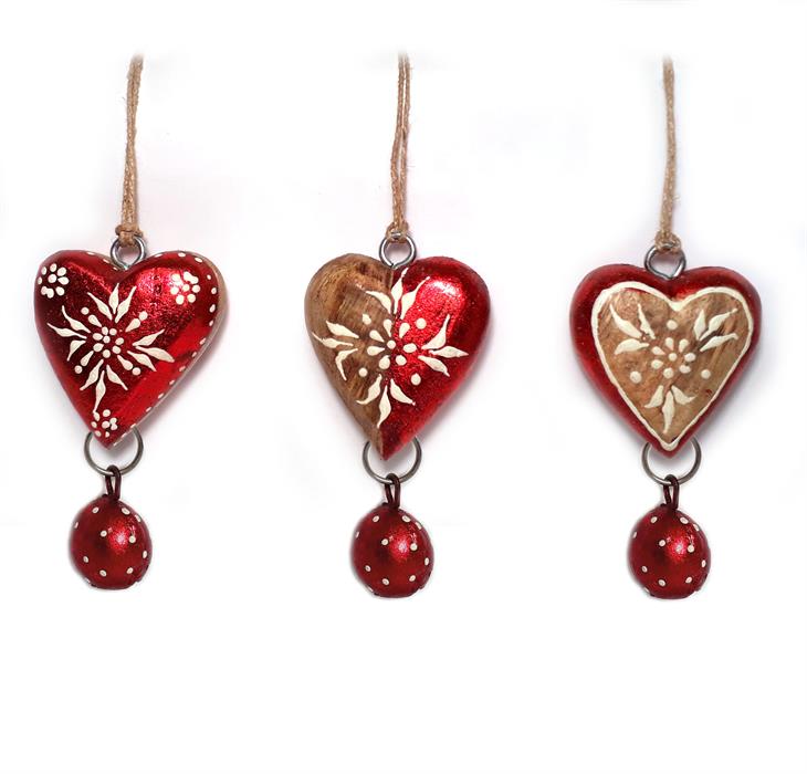 Holz Herz rot mittel mit Glocke rund, 4 x 2.5cm, 3 assortiert - 24 Stück im DisplayDaten