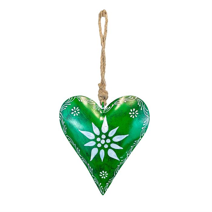 Metallherz grün mit Edelweiss zum aufhängen, 15 x 15 x 3cm