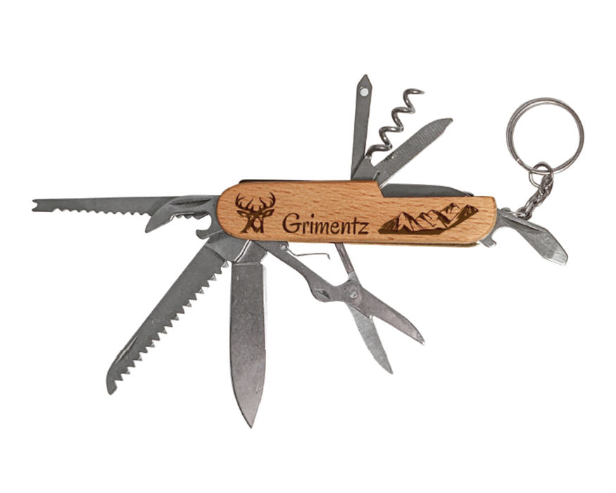 Mehrzweckmesser mit Holzgriff 15 cm, mit Grimentz, Hirsch und Berg