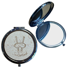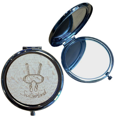 Taschenspiegel mit Holzdeckel, Gravur Switzerland, Ski und Brille