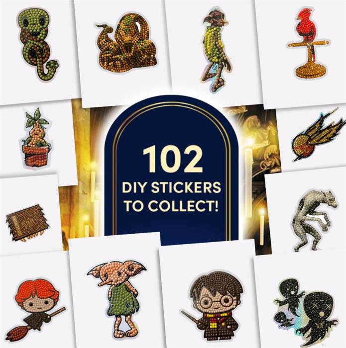 Jeder Sticker ist mit einer selbstklebenden Oberfläche versehen, auf die du mit dem beiliegenden Werkzeug winzige, glitzernde Kristalle aufbringst – ganz ähnlich wie beim Malen nach Zahlen, nur mit funkelnden Steinen! So entstehen Schritt für Schritt zauberhafte Motive aus der Harry-Potter-Welt, die du anschliessend im Album einkleben und so sammeln oder als Deko verwenden kannst. Es gibt total 102 Sticker zum sammeln und tauschen.