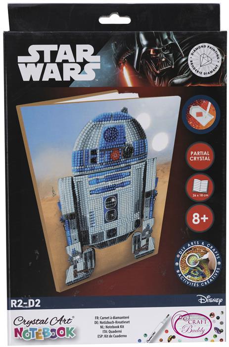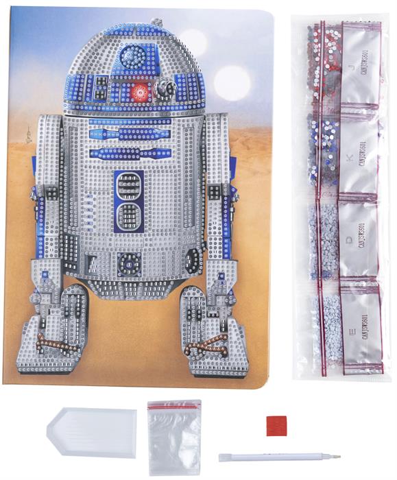 Notizbuch mit 50 linierten Seiten, Designschablone, Bastelzubehör, farbige Kristalle und eine Bastelanleitung.