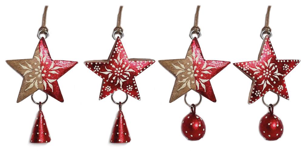 Holz Stern rot mit Glocke, 5 x 2cm, 4 assortiert - 24 Stück im DisplayDonnées