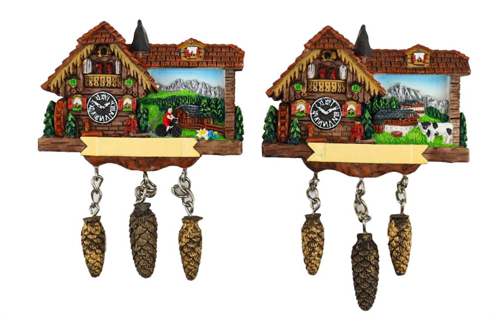 Magnet Kuckucksuhr mit Velofahrer und Kuh, 11.5x7cm, 2 assortiert