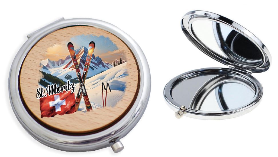 Taschenspiegel mit Holzdeckel, Winter Ski Design, St. Moritz