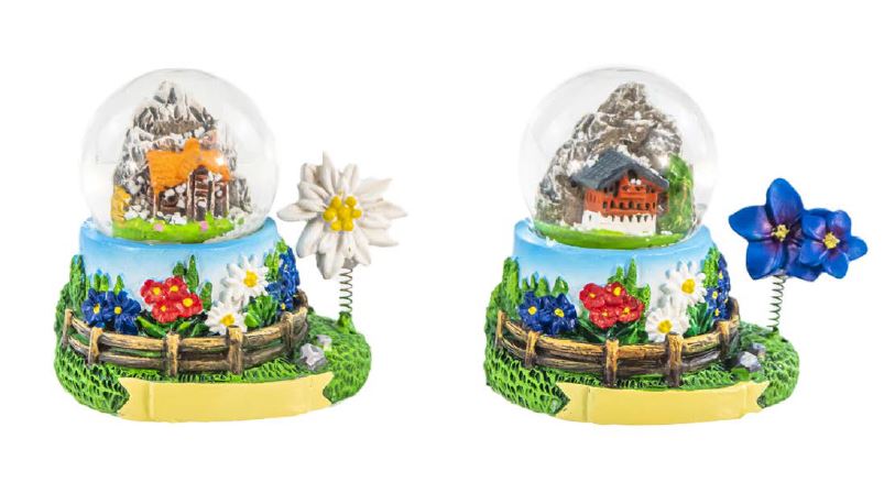 Schneekugel Sommer Almhütte mit beweglichem Enzian/ Edelweiss, 4cm, 2 assortiert