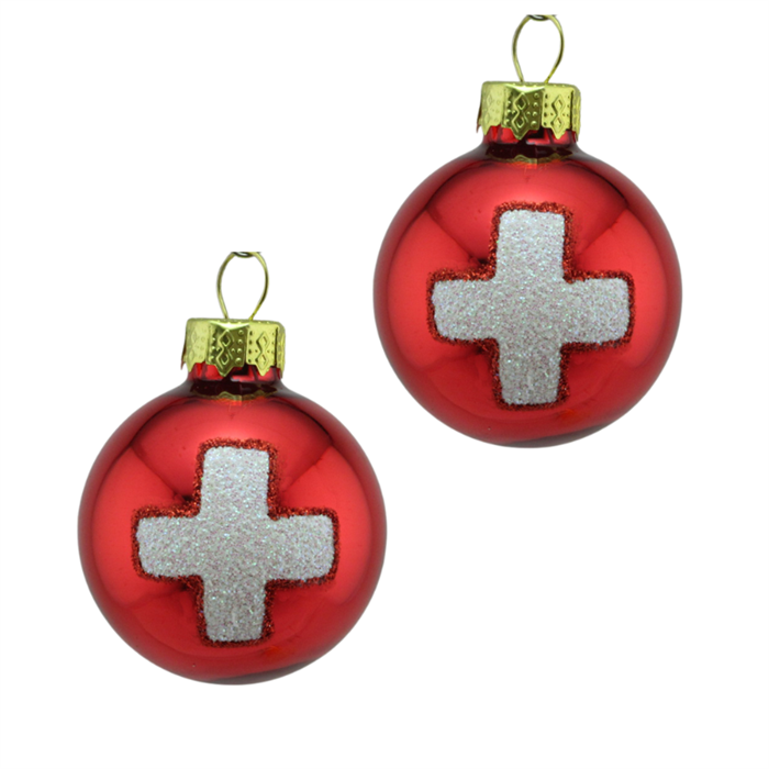 Glas Ornament 2 kleine Kugeln Schweizerkreuz, 4cm