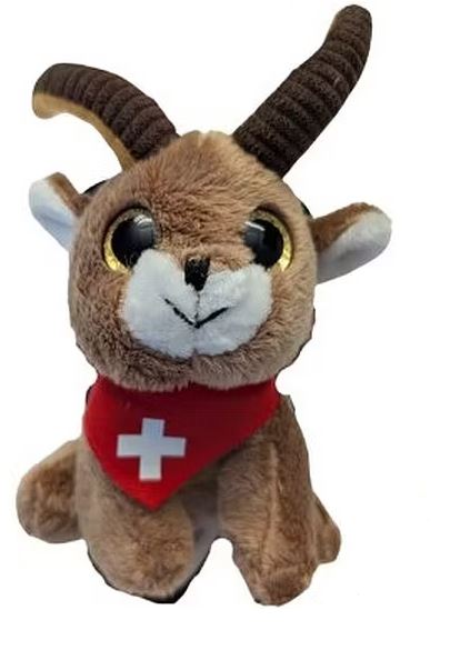 Steinbock Plüschtier sitzend mit riesigen braunen Augen und viel Enthusiasmus