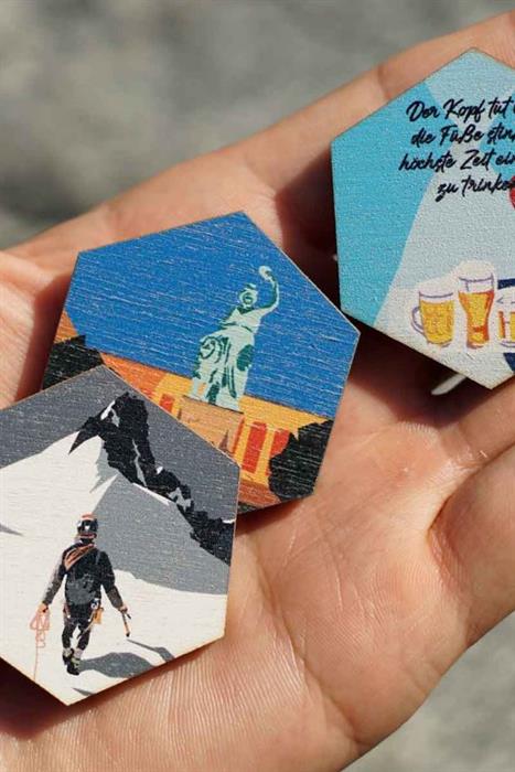 Charmanter Magnet aus Echtholz mit alpinem oder Stadt-Motiv – ideal als Erinnerung, zum Sammeln oder Verschenken.