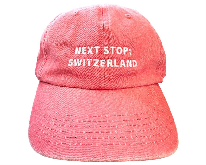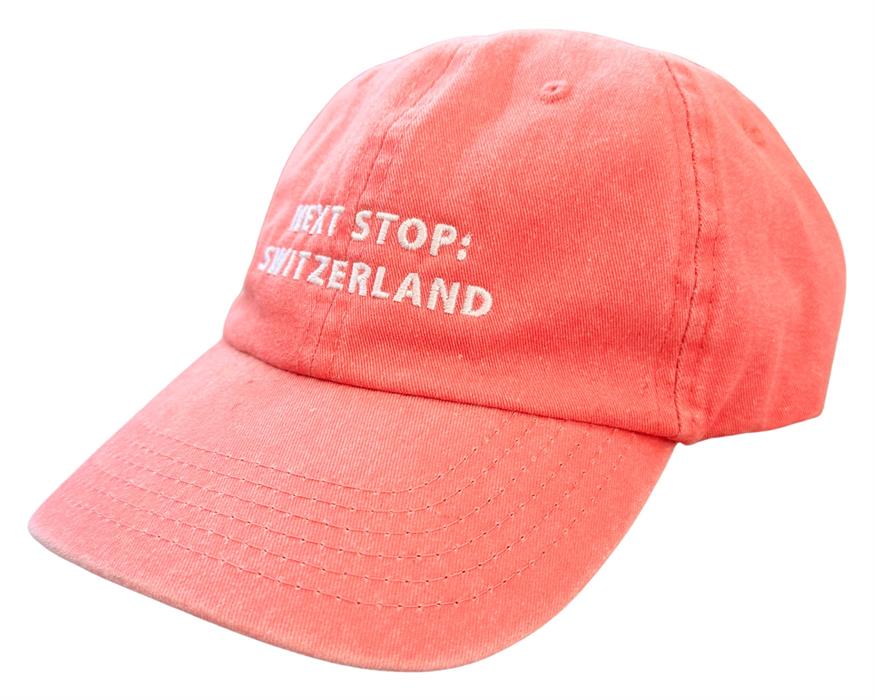 Die hellrote Cap mit der Aufschrift "Next Stop: Switzerland" ist dein perfekter Begleiter für dein nächstes Abenteuer.