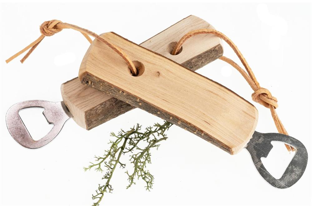 Flaschenöffner rustikale Erle mit Rinde und Lederband 16cm